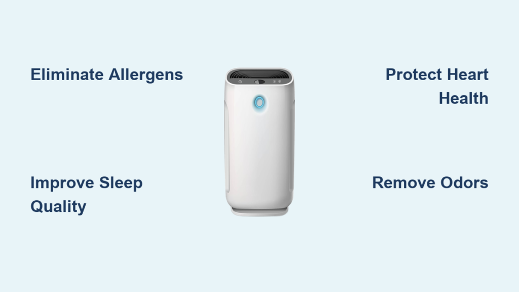 If your allergy symptoms worsen at night or upon waking, indoor allergens are likely the culprit—not just outdoor pollen. Your bedroom harbors dust mites in bedding, pet dander in carpets, and mold spores in humid corners, creating a perfect storm of respiratory irritants. HEPA air purifiers remove at least 99.97% of particles measuring 0.3 microns or larger, including the microscopic allergens that trigger sneezing, congestion, and itchy eyes. Place a unit on your nightstand where air intake remains unobstructed, and run it continuously throughout the night on sleep mode to dramatically reduce allergen concentration while you rest.