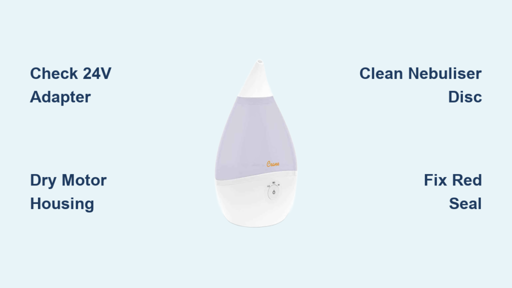 Final note: If mist still doesn’t appear after completing all steps, the ultrasonic motor likely failed from prolonged water exposure or voltage issues. Recycle plastic components (tank, lid) curbside and take the electronic base to e-waste—attempting internal repairs voids safety certifications. For immediate relief, run the diagnostic checklist again; 8 of 10 users miss the red seal alignment on first attempt. With proper maintenance using distilled water and weekly cleanings, your Crane humidifier will deliver reliable mist for years—no steaming surprises required.