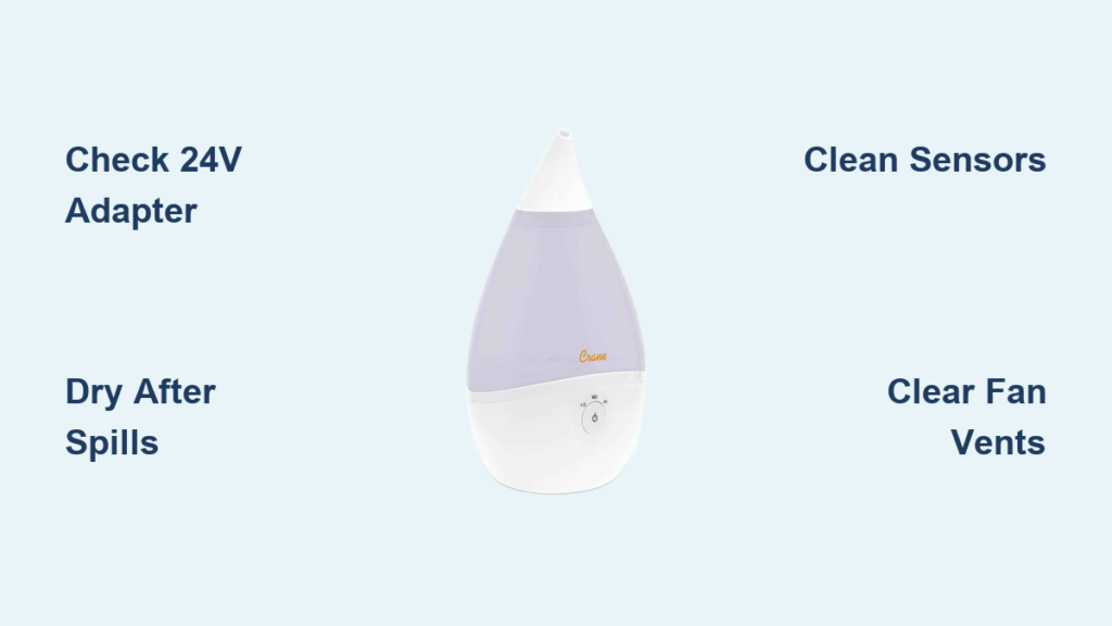 Crane humidifiers demand their factory-supplied 24-volt adapter—no exceptions. Using generic plugs from your “electrical box” creates a classic “lights on but no mist” failure. Why? Generic adapters deliver insufficient current to energize the 24V motor, even if indicator lights illuminate. This mistake affects Drop, Droplet, Mini Adorable, and 4-in-1 models equally.