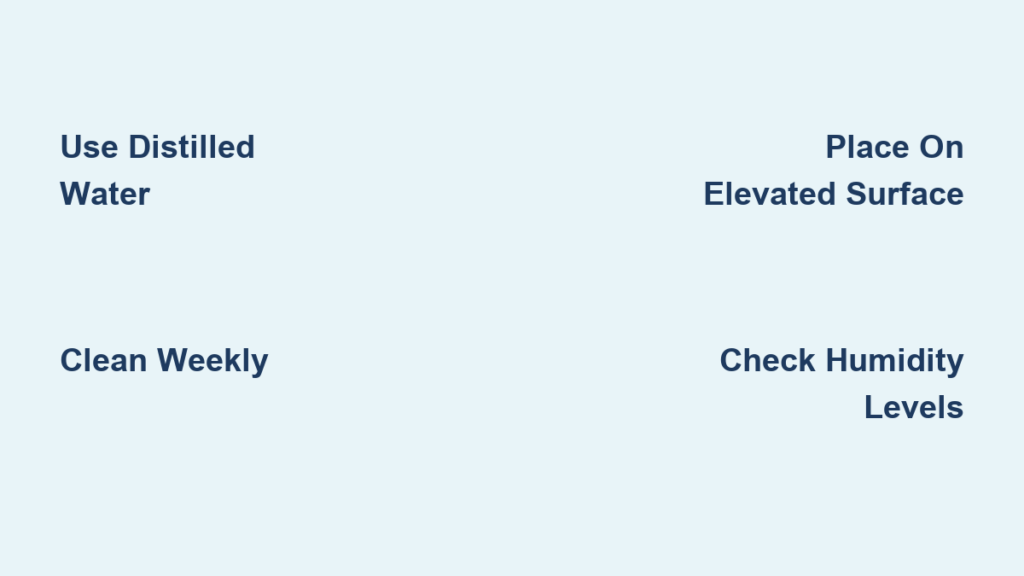 Connect the power adapter directly to a wall outlet—avoid extension cords that might cause voltage fluctuations. Press the power button (typically a circle icon) to activate the unit. Most basic models automatically start at medium mist output, indicated by a steady LED light.
